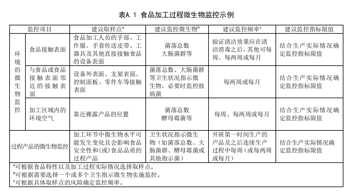 A.3 食品加工過程的微生物監(jiān)控,主要包括環(huán)境微生物監(jiān)控和過程產(chǎn)品的微生物監(jiān)控。環(huán)境微生物監(jiān)控主要用于評(píng)判加工過程的衛(wèi)生控制狀況,以及找出可能存在的污染源。通常環(huán)境監(jiān)控對(duì)象包括食品接觸表面、與食品或食品接觸表面鄰近的接觸表面、以及環(huán)境空氣。過程產(chǎn)品的微生物監(jiān)控主要用于評(píng)估加工過程衛(wèi)生控制能力和產(chǎn)品衛(wèi)生狀況。